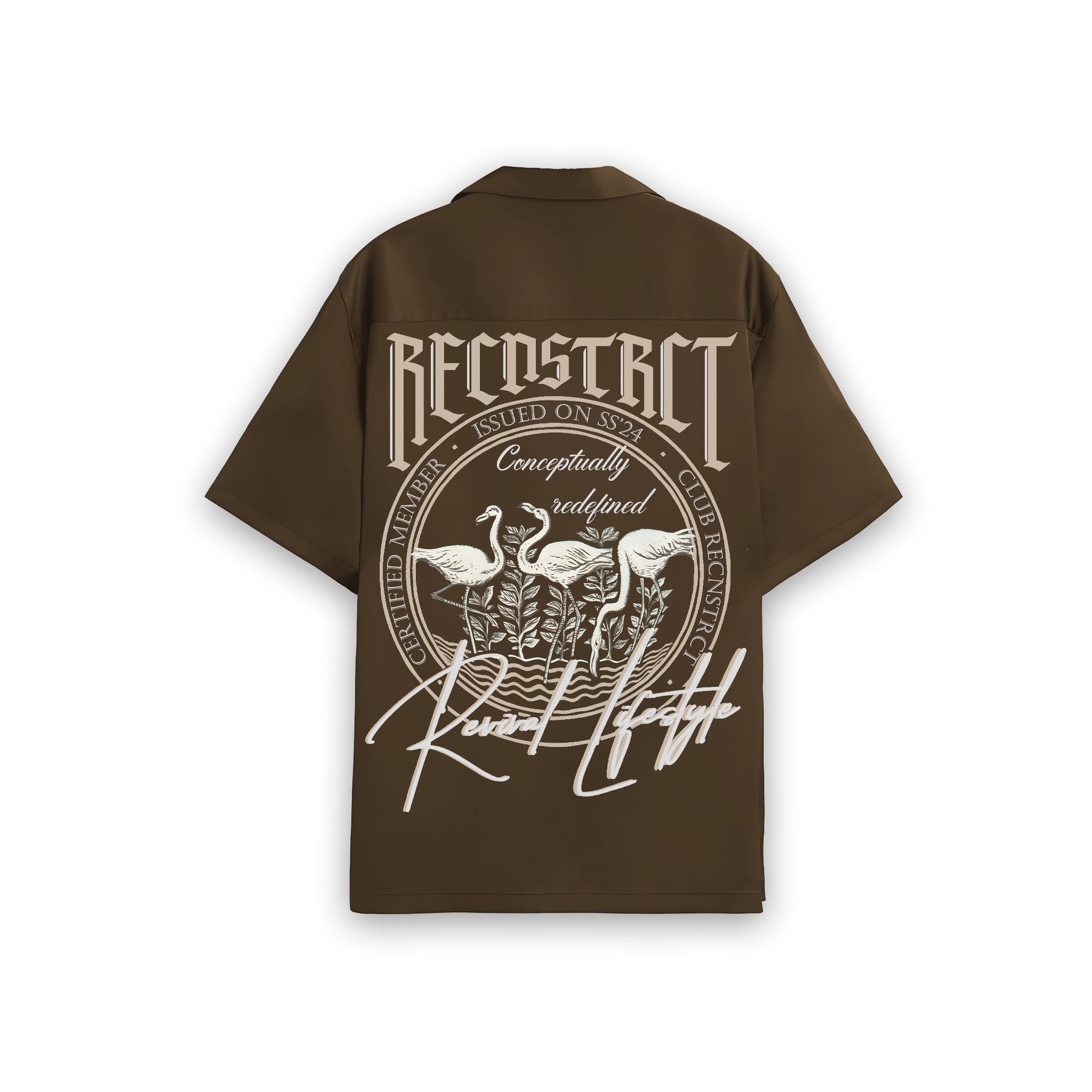 Oversized half-sleeves bowling shirt with CLUB RECNSTRCT Revival Lifestyle print on the front and the back. This shirt can be styled open or buttoned-up.